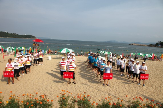 比賽越來越精彩,競爭越來越激烈。最后一個項目是障礙接力。這項比賽刺激好玩,氣氛活躍,觀賞性強,對運動員的個人體能及技術提出了較高的要求,對團隊協(xié)作完成任務的能力也是一個考驗。隨著主持人一聲令下,運動員們迅速奔向海邊取水,不顧“濕身”,控制好的就來個“蜻蜓點水”,控制稍遜的就直接和大海來個“擁抱”。返回的時候是要吃點苦頭的,面對不足一米高的障礙網(wǎng),有匍匐前進的,有奮力爬行的,有蹲著挪移的,“洋相”盡出,令人捧腹。賽場上高潮迭起,戰(zhàn)火彌漫,場邊觀眾笑聲、加油聲、歡呼聲、喝彩聲響成一片,熱鬧非凡。經(jīng)過激烈的角逐,企業(yè)一隊拔得頭籌,公司一隊、公司二隊、企業(yè)二隊分獲二、三、四名。