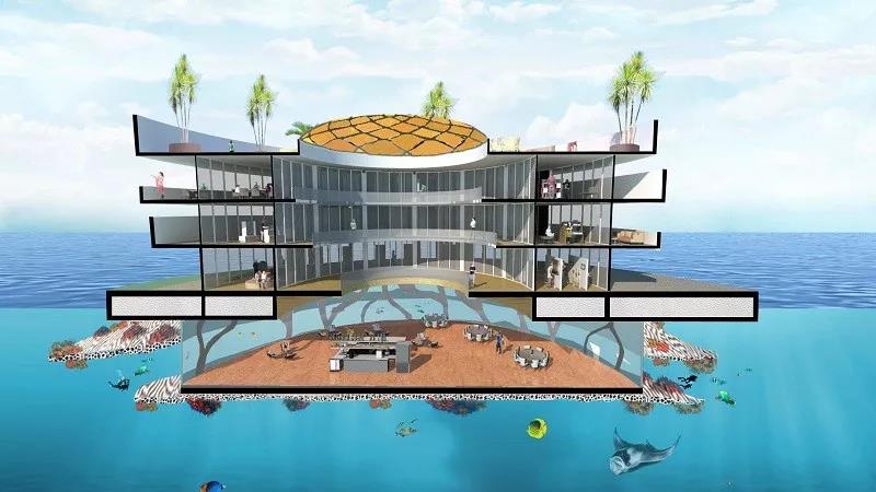 The proposed underwater sightseeing hall has considered measures against typhoon, marine biodiversity, as well as water supply and circulation. It turns ecological weakness to an aesthetic tourist highlight, setting an example of future ocean development.