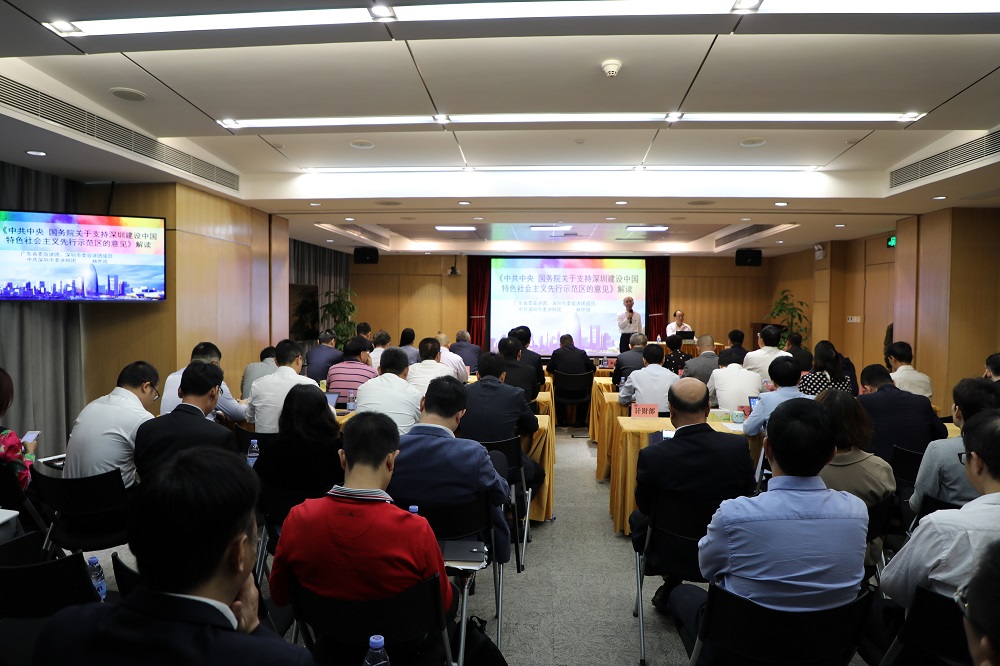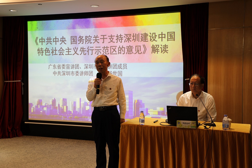 會上,中共深圳市委講師團(tuán)楊世國團(tuán)長就《意見》進(jìn)行了專題解讀。楊世國團(tuán)長從《意見》的背景和意義、主要內(nèi)容、政策創(chuàng)新點(diǎn)和亮點(diǎn)3個(gè)方面進(jìn)行了精彩講授。他以政治、現(xiàn)實(shí)和歷史三個(gè)維度,分析《意見》出臺的重大意義;從《意見》的總體要求、戰(zhàn)略路徑、保障措施3方面闡釋主要內(nèi)容;從創(chuàng)建綜合性國家科學(xué)中心、推進(jìn)綜合授權(quán)改革試點(diǎn)、用足用好經(jīng)濟(jì)特區(qū)立法權(quán)、全面深化前海改革開放、加快建設(shè)深港科技創(chuàng)新合作區(qū)、積極推進(jìn)創(chuàng)業(yè)板改革等方面講解《意見》政策創(chuàng)新點(diǎn),整個(gè)課程內(nèi)容豐富、主題鮮明、論述深刻,具有很強(qiáng)的思想性、理論性、實(shí)踐性。