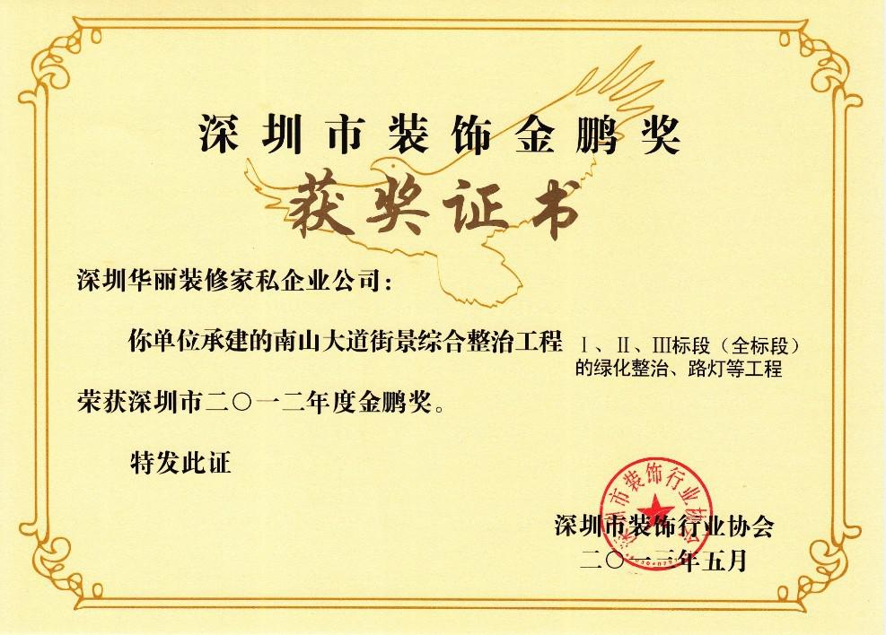 集團(tuán)參股企業(yè)華麗裝修家私企業(yè)公司承建的“南山大道街景綜合整治工程Ⅲ標(biāo)段”喜獲2012年度深圳裝飾工程金鵬獎(jiǎng)(公裝類)。2013年8月,深圳市裝飾行業(yè)協(xié)會(huì)授予華麗公司“深圳市裝飾工程金鵬獎(jiǎng)”獎(jiǎng)杯和證書(shū),這是華麗公司繼2002年以來(lái)第五次榮獲 “深圳市裝飾工程金鵬獎(jiǎng)”。該獎(jiǎng)是我市優(yōu)質(zhì)裝飾工程獎(jiǎng),也是我市裝飾工程市級(jí)質(zhì)量獎(jiǎng),根據(jù)《深圳市裝飾工程金鵬獎(jiǎng)評(píng)選辦法》有關(guān)規(guī)定,深圳市裝飾行業(yè)協(xié)會(huì)秘書(shū)處組織專家對(duì)2012年度企業(yè)申報(bào)“金鵬獎(jiǎng)”資料及工程現(xiàn)場(chǎng)認(rèn)真檢查評(píng)比,經(jīng)“金鵬獎(jiǎng)”評(píng)委會(huì)評(píng)審?fù)ㄟ^(guò),華麗公司榮獲此獎(jiǎng)。